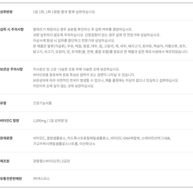 | 원료명 및 함량 | 상품 상세페이지 참조 | 영양정보 | 상품 상세페이지 참조 |