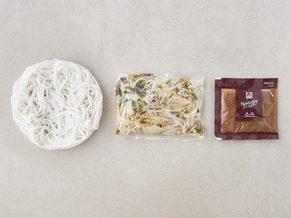 면, 숙주, 쇠고기, 양파, 쪽파, 소스로 구성되어 있습니다.
