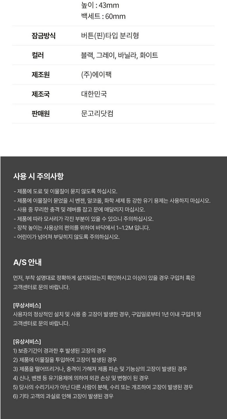 | 품명 및 모델명 | 릭스(LLYX) 103 방문손잡이 | 인증/허가 사항 | 해당없음 |
