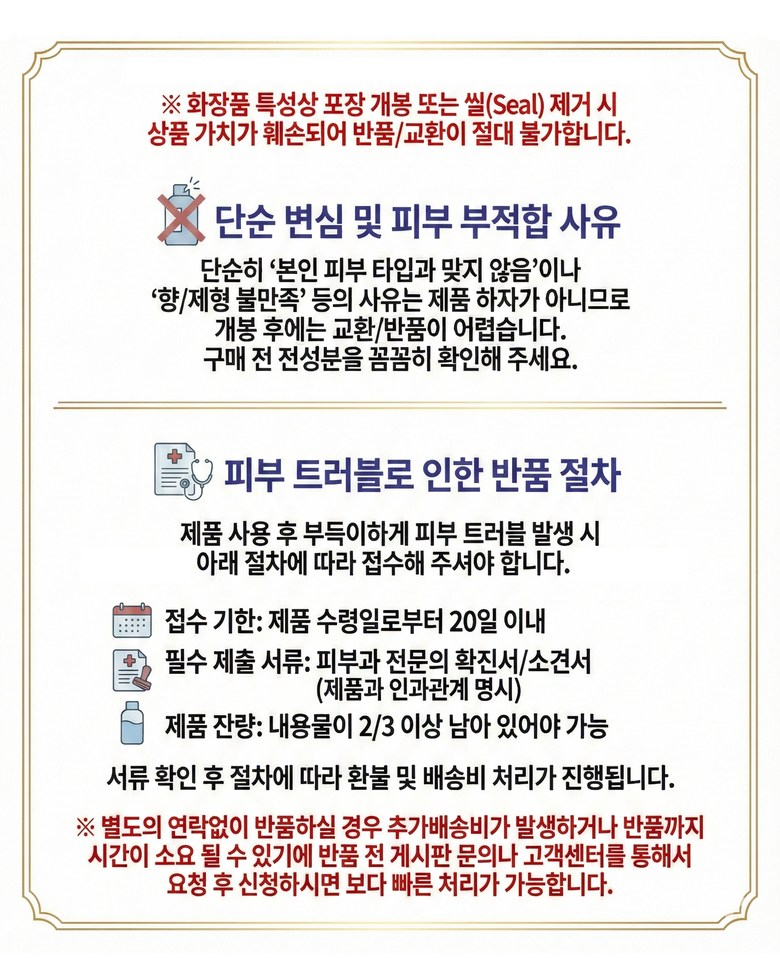 | 교환/반품 신청 기준일 | ㆍ단순변심에 의한 교환/반품은 제품 수령 후 7일 이내까지, 교환/반품 제한사항에 해당하지 않는 경우에만 가능 (배송비용과 교환/반품 비용 왕복배송비 고객부담) ㆍ상품의 내용이 표시·광고의 내용과 다른 경우에는 상품을 수령한 날부터 3개월 이내, 그 사실을 안 날 또는 알 수 있었던 날부터 |