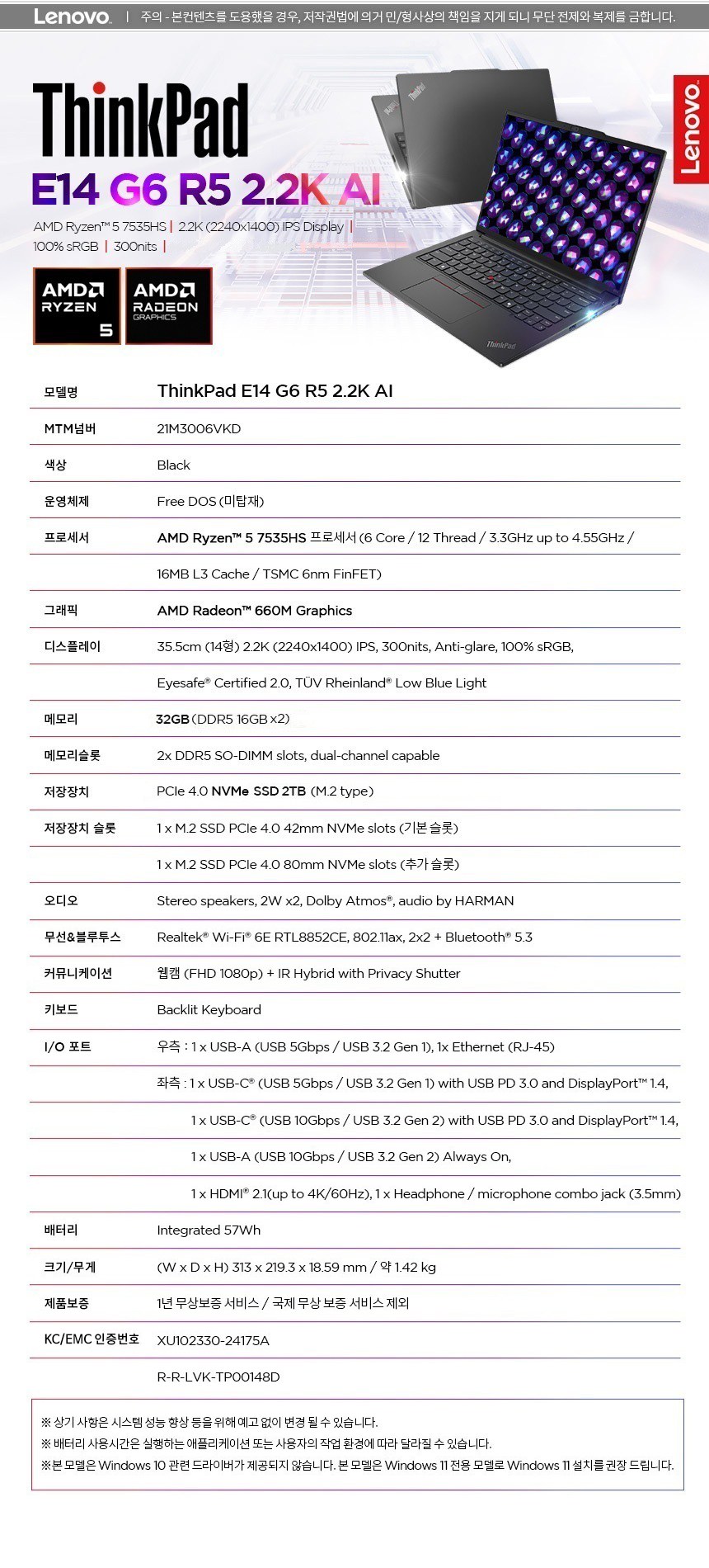 | 품명 및 모델명 | 노트북 / Thinkpad E14 G6 R5 2.2K AI (TP00148D, ThinkPad E14 gen 6) | KC 인증정보 | XU102330-24175A, R-R-LVK-TP00148D |