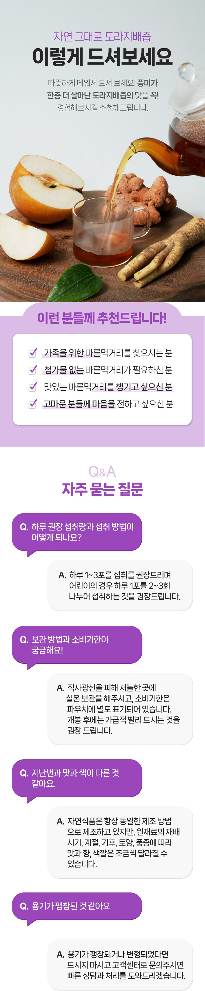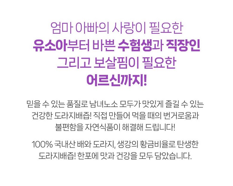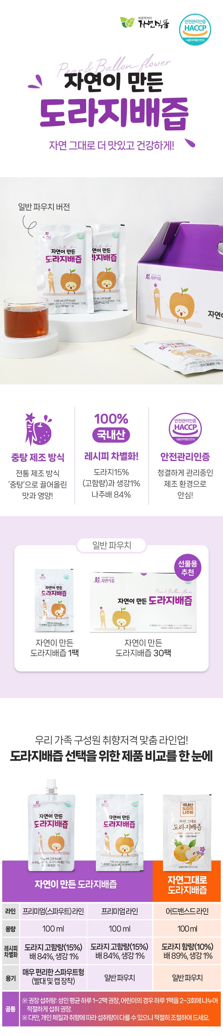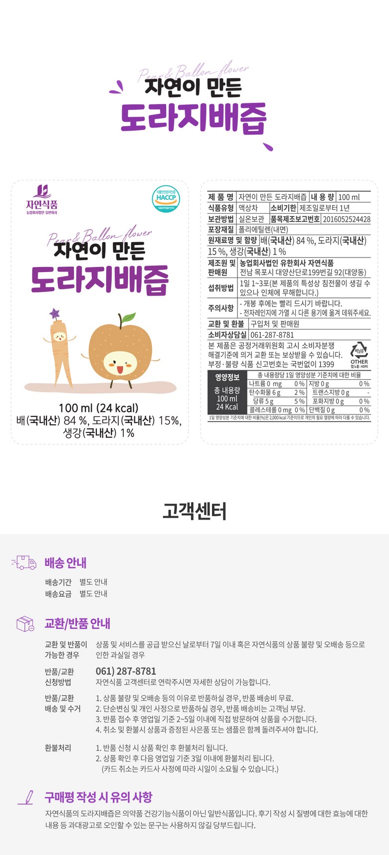 | 제품명 | 자연이 만든 도라지배즙 | 식품의 유형 | 액상차 |