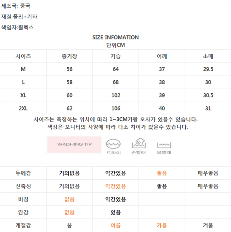 | 제조국 | 중국 | 세탁방법 및 취급시 주의사항 | 상품 상세페이지 참조 |