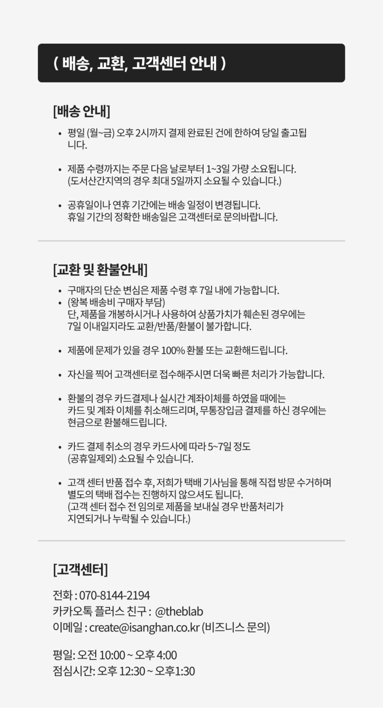 - ㆍ모니터 해상도의 차이로 인해 색상이나 이미지가 실제와 달라, 고객이 단순 변심으로 교환/반품을 무료로 요청하는 경우