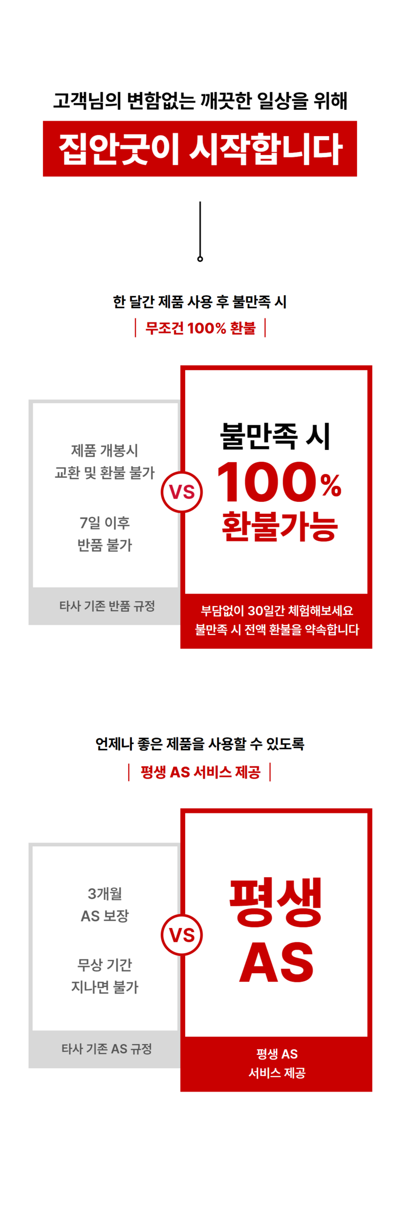 | 교환/반품 신청 기준일 | ㆍ단순변심에 의한 교환/반품은 제품 수령 후 7일 이내까지, 교환/반품 제한사항에 해당하지 않는 경우에만 가능 (배송비용과 교환/반품 비용 왕복배송비 고객부담) ㆍ상품의 내용이 표시·광고의 내용과 다른 경우에는 상품을 수령한 날부터 3개월 이내, 그 사실을 안 날 또는 알 수 있었던 날부터 |