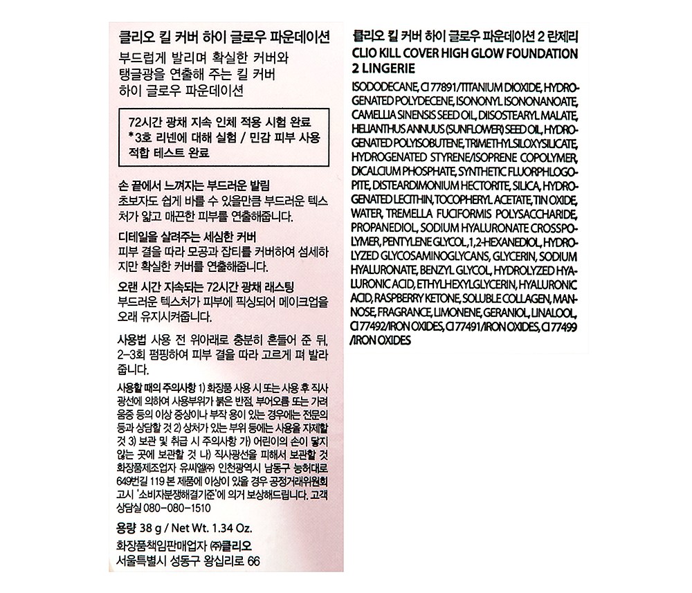| 화장품제조업자, 화장품책임판매업자 및 맞춤형화장품판매업자 | 유씨엘(주) / (주)클리오 | 제조국 | 대한민국 |