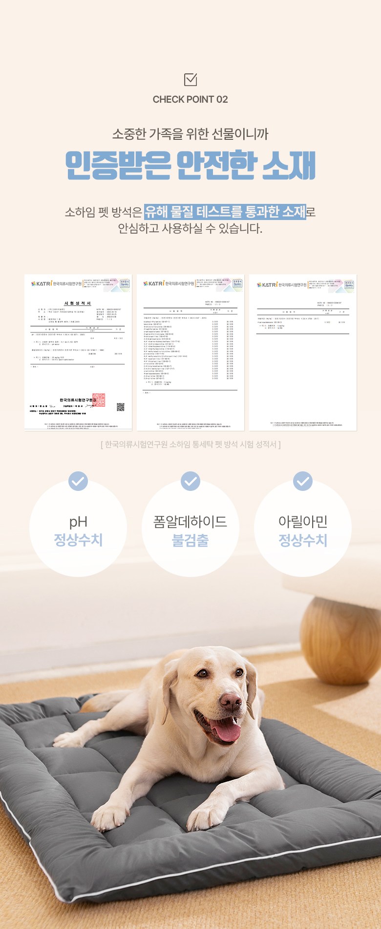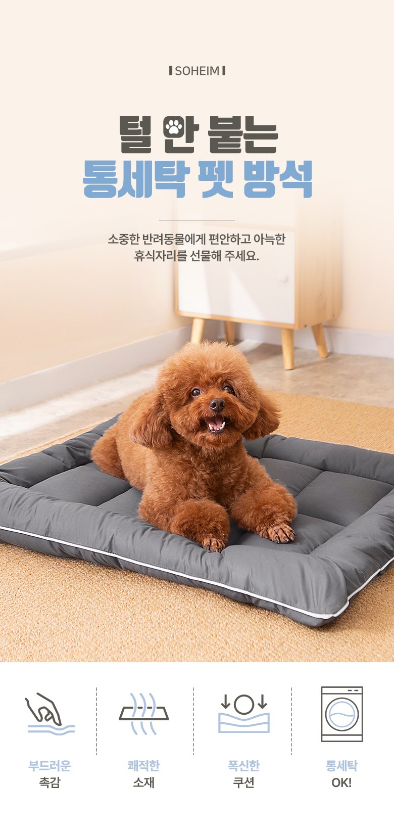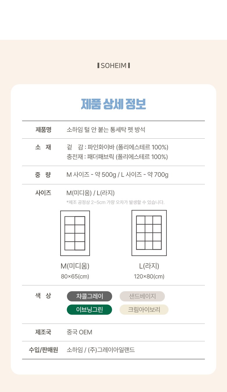 | 품명 및 모델명 | 소하임 털 안 붙는 통세탁 펫 방석 | 인증/허가 사항 | 해당없음 |