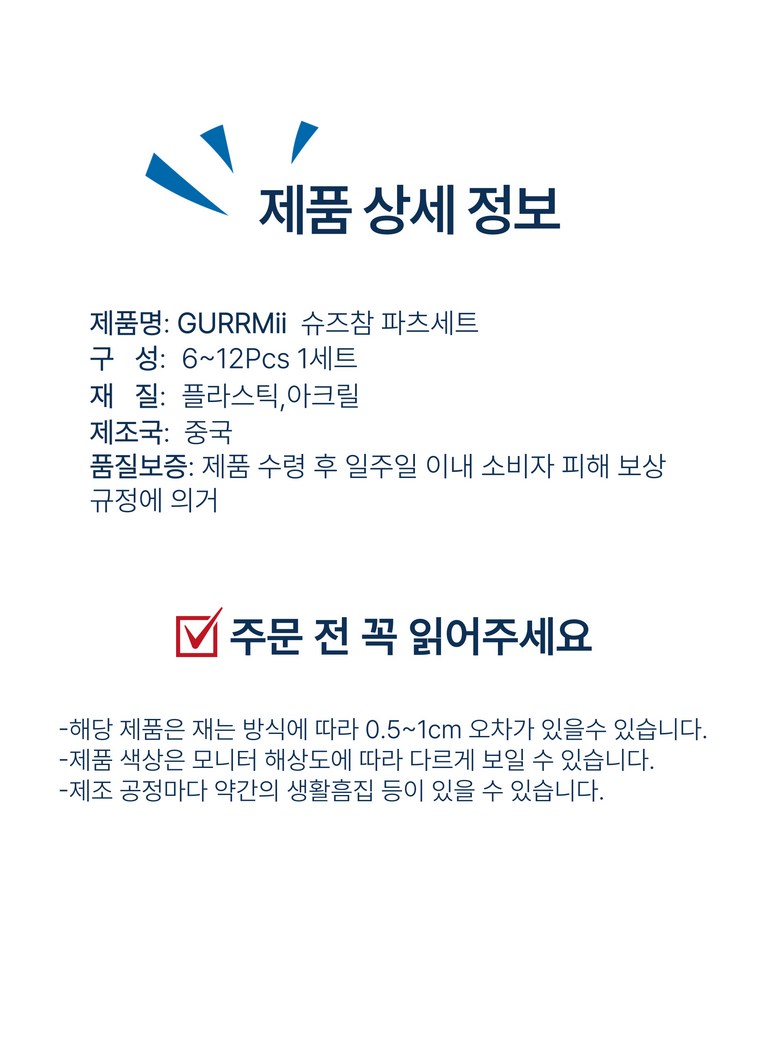 | 품명 및 모델명 | GURRMii 신발꾸미기 슬리퍼악세사리 파츠8종 슈즈참 | 인증/허가 사항 | 해당사항없음 |