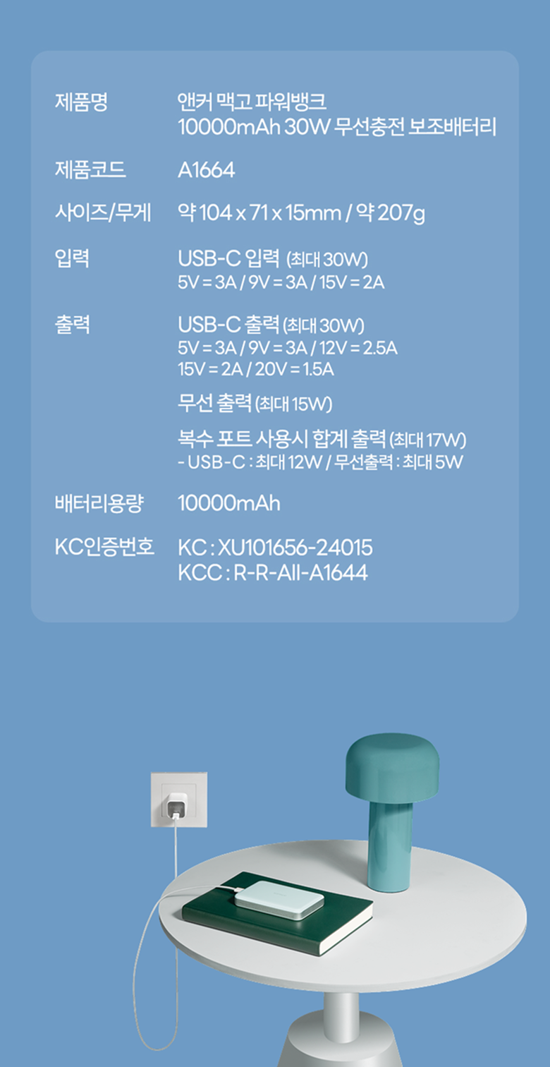 | 품명 및 모델명 | 앤커 맥고 파워뱅크 10000mAh 30W 보조배터리 A1664 | KC 인증정보 | KC: XU101656-24015KCC: R-R-AIl-A1664 |