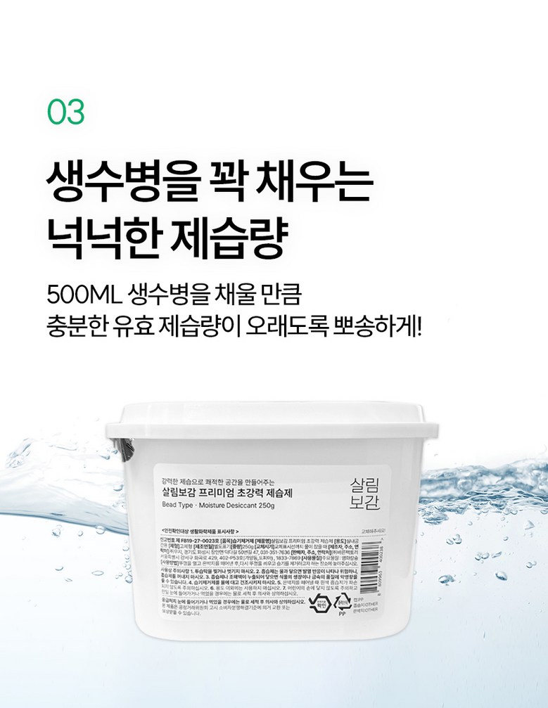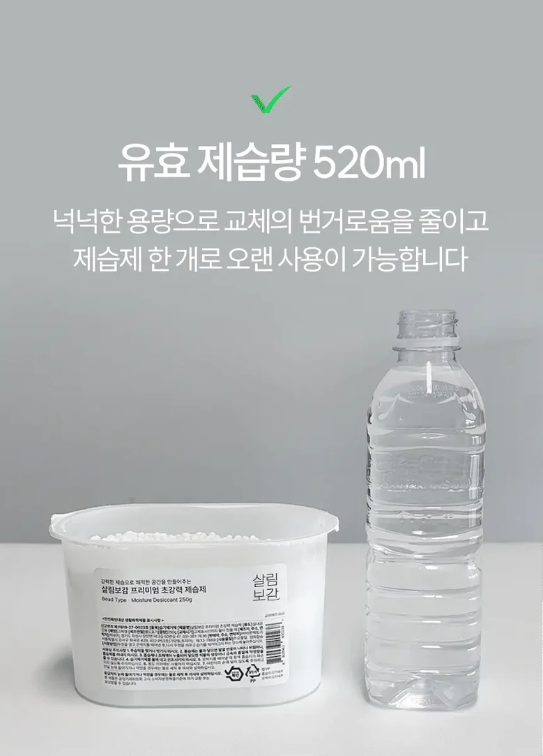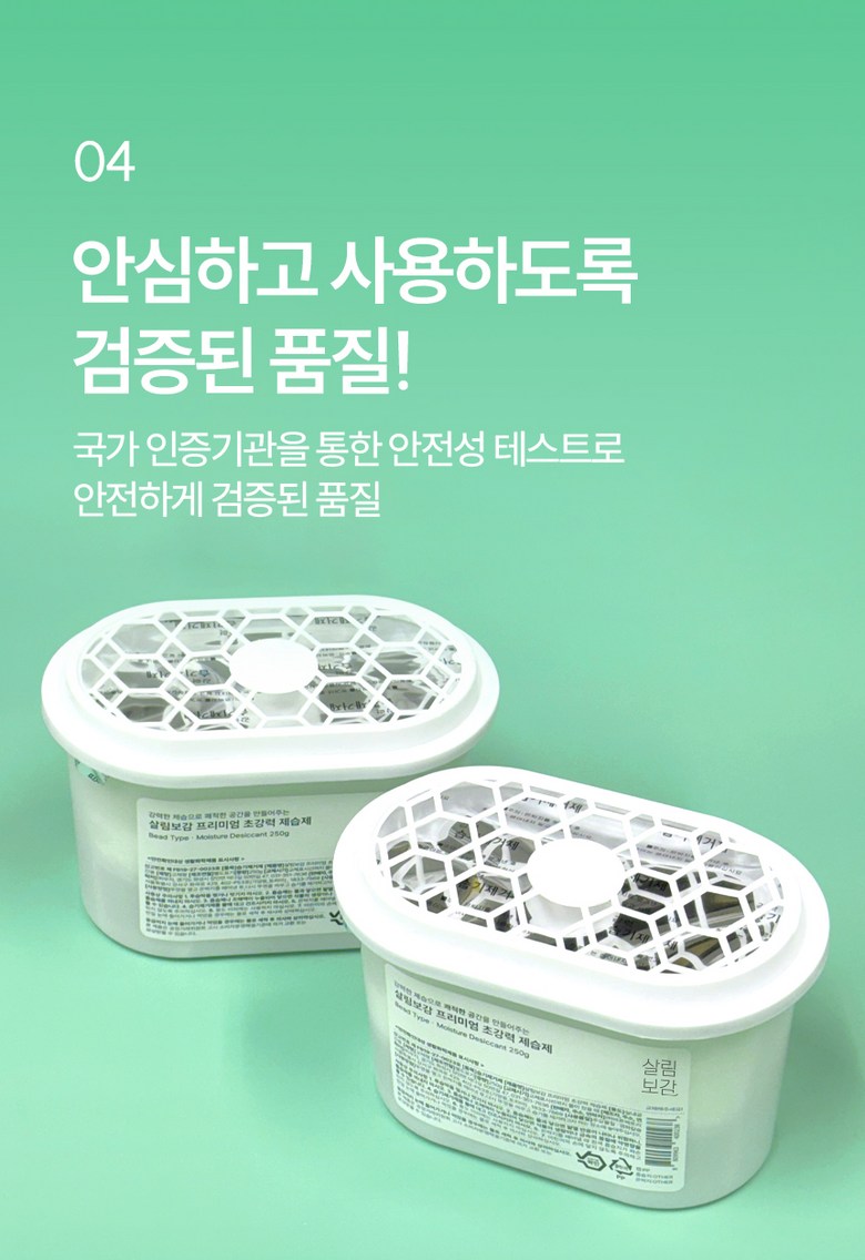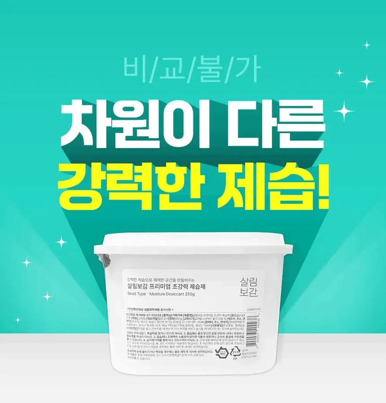 | 품목 및 제품명 | 살림보감 프리미엄 초강력 제습제 | 용도(표백제의 경우 계열을 함께표시) 및 제형 | 상품 상세페이지 참조 |
