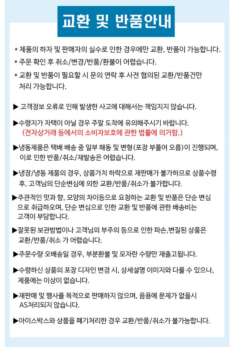 - ㆍ교환/반품에 관한 일반적인 사항은 판매자가 제시사항보다 관계법령이 우선합니다.