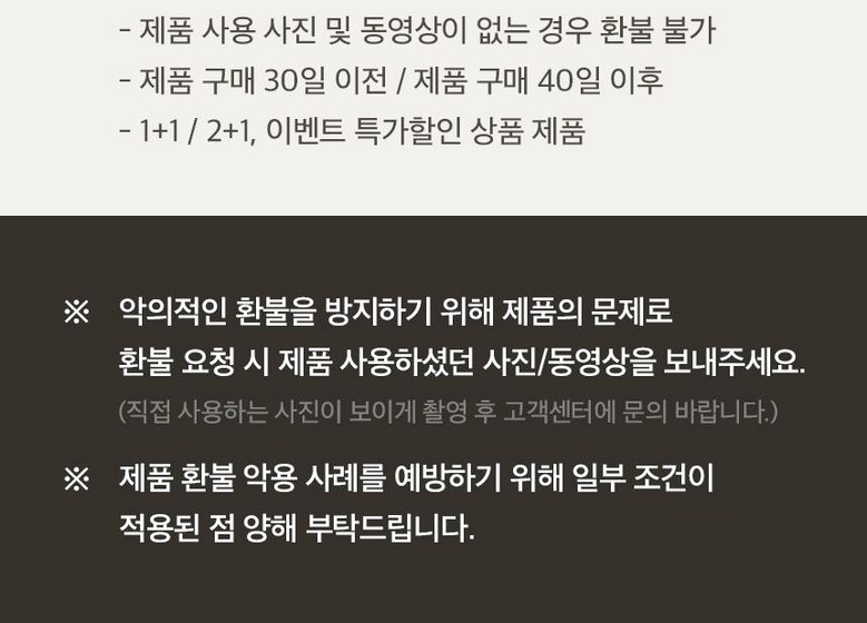 - ㆍ모니터 해상도의 차이로 인해 색상이나 이미지가 실제와 달라, 고객이 단순 변심으로 교환/반품을 무료로 요청하는 경우