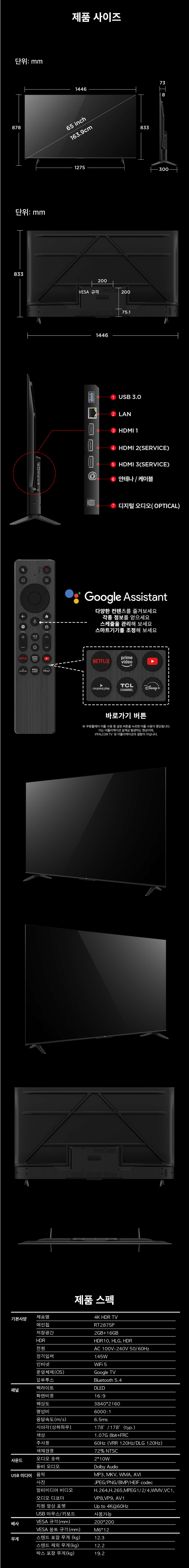 | 품명 및 모델명 | 아이팔콘 4K UHD LED HDR 스마트TV, 65U65, 스탠드형, 방문설치 / 65U65 | KC 인증정보 | 본품 : XU090397-25111, R-R-TcL-65U65 / 모듈 : R-R-Gsd-WKCT16R2501 |