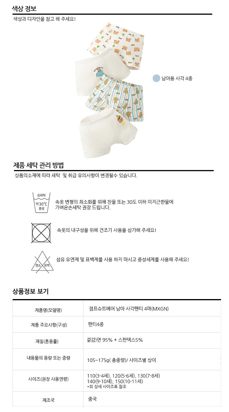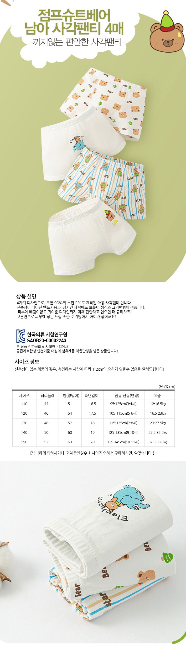 | 품명 및 모델명 | 점프슈트베어 남아 사각팬티 4매입_140(9-10세) 혼합색상 | KC 인증정보 | 유/KC마크 |