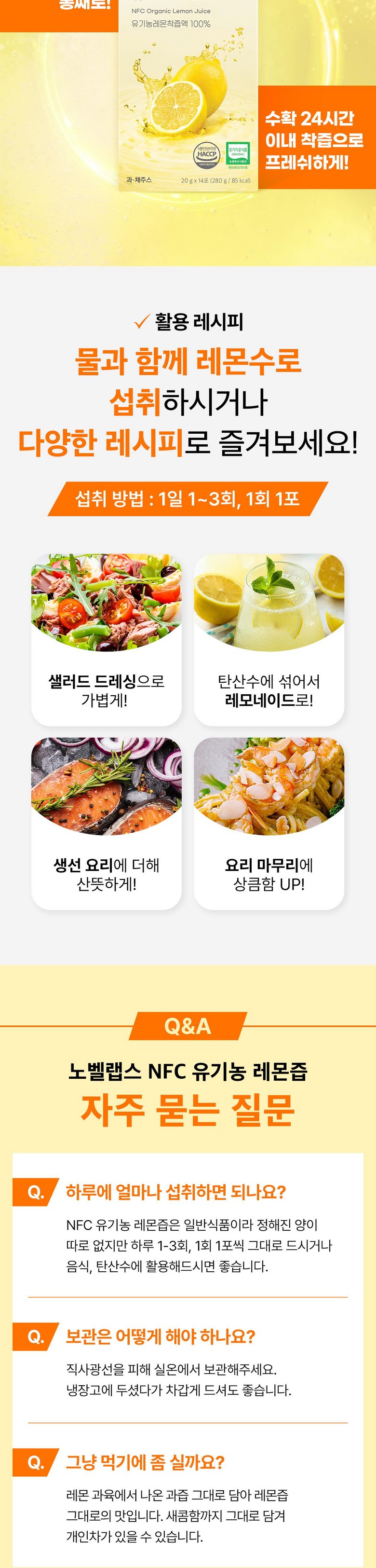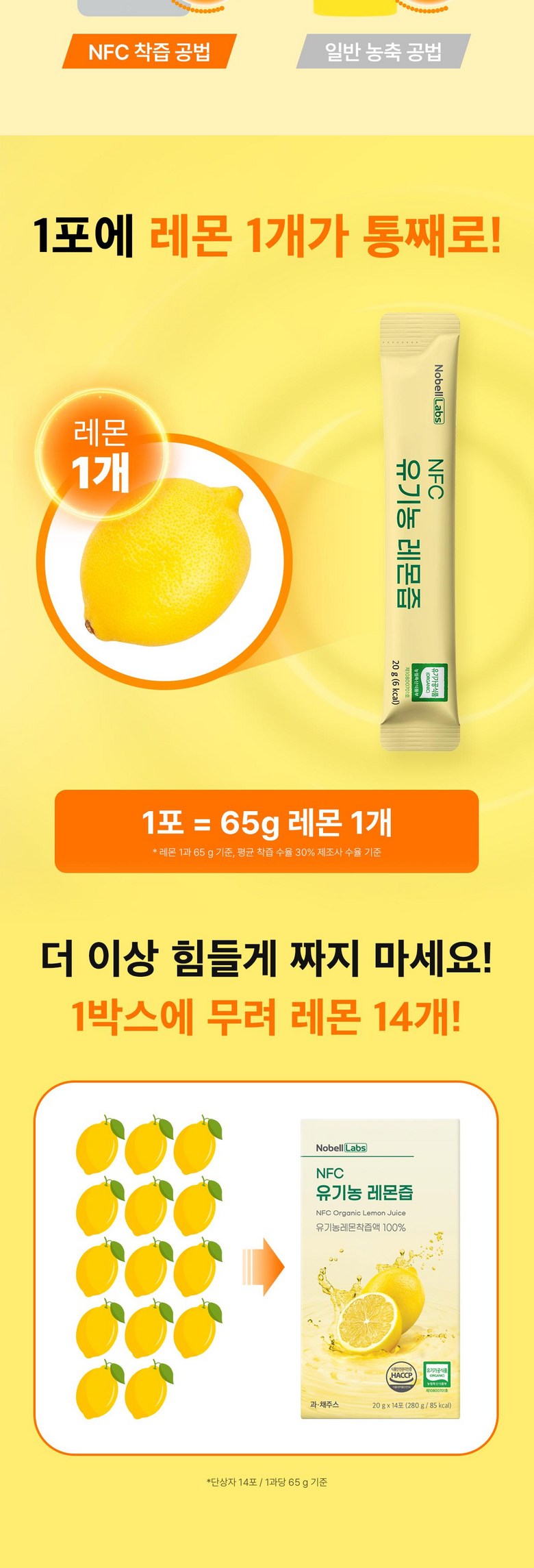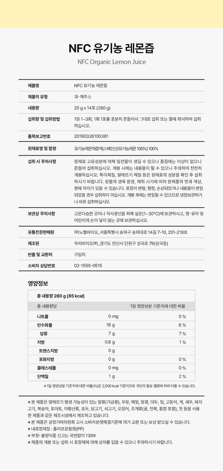 | 제품명 | 노벨랩스 NFC 유기농 레몬즙 | 식품의 유형 | 과채주스 |