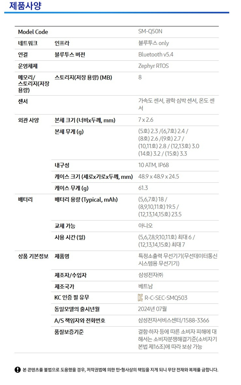 | 품명 및 모델명 | 갤럭시링/ 링 : SM-Q508, 크래들 : EP-QQ508 | KC 인증정보 | 링 : R-C-SEC-SMQ503 | 크래들 : R-R-SEC-EPQQ503, 크래들 전지 : YU10211-21019, 링 전지: YU101308-24002 |