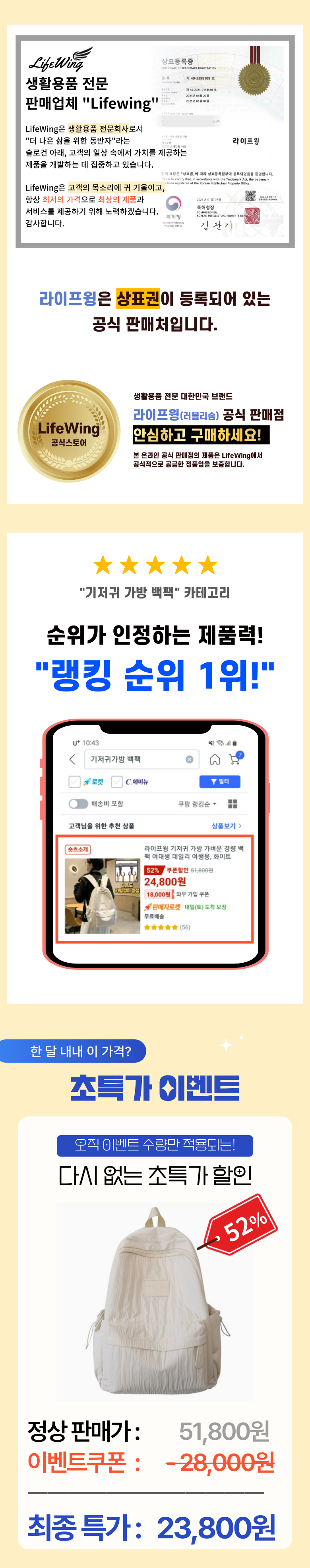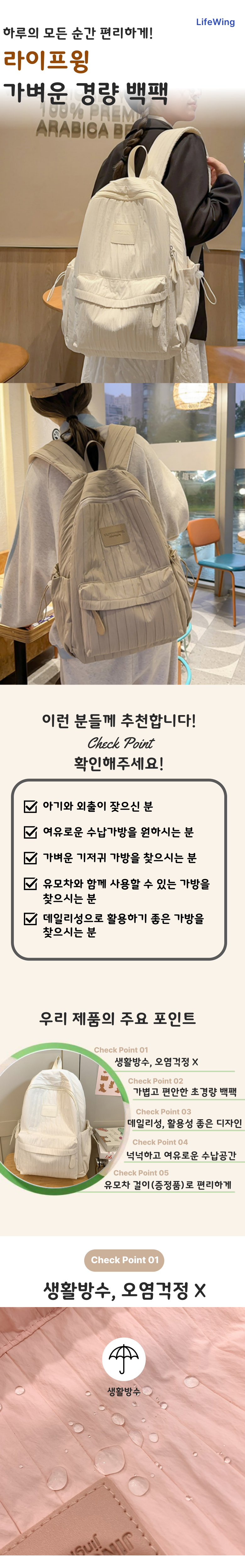| 품명 및 모델명 | 라이프윙 기저귀 가방 가벼운 경량 백팩 여대생 데일리 여행용 | 인증/허가 사항 | 인증 해당사항 없음 |