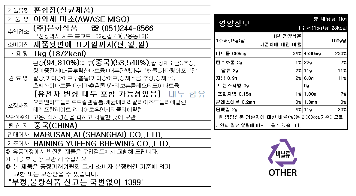 | 포장단위별 내용물의 용량(중량), 수량 | 1kg, 1개 | 원재료명 및 함량 | 컨텐츠 참조 |