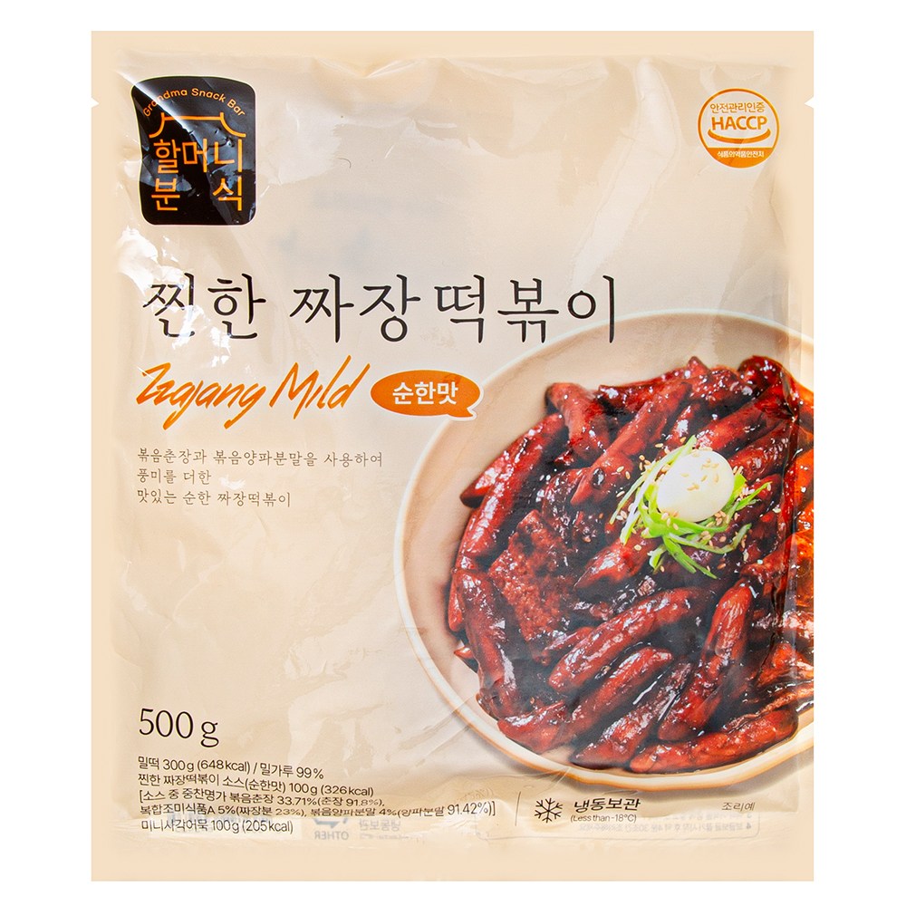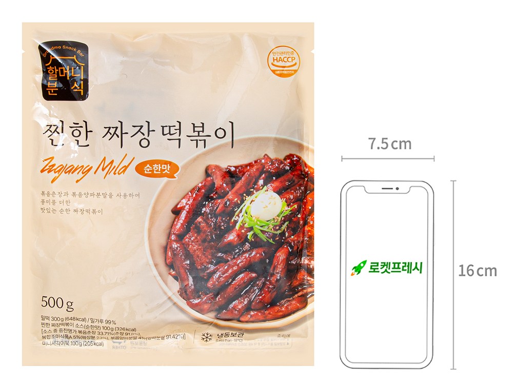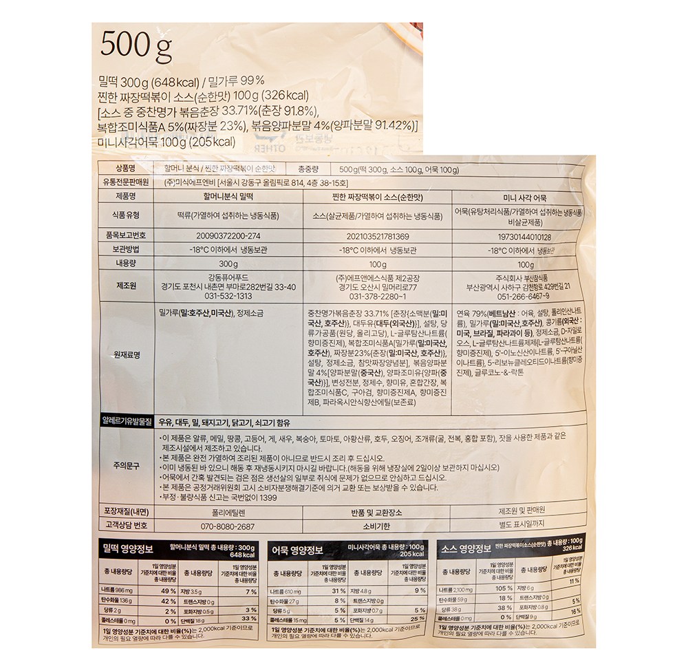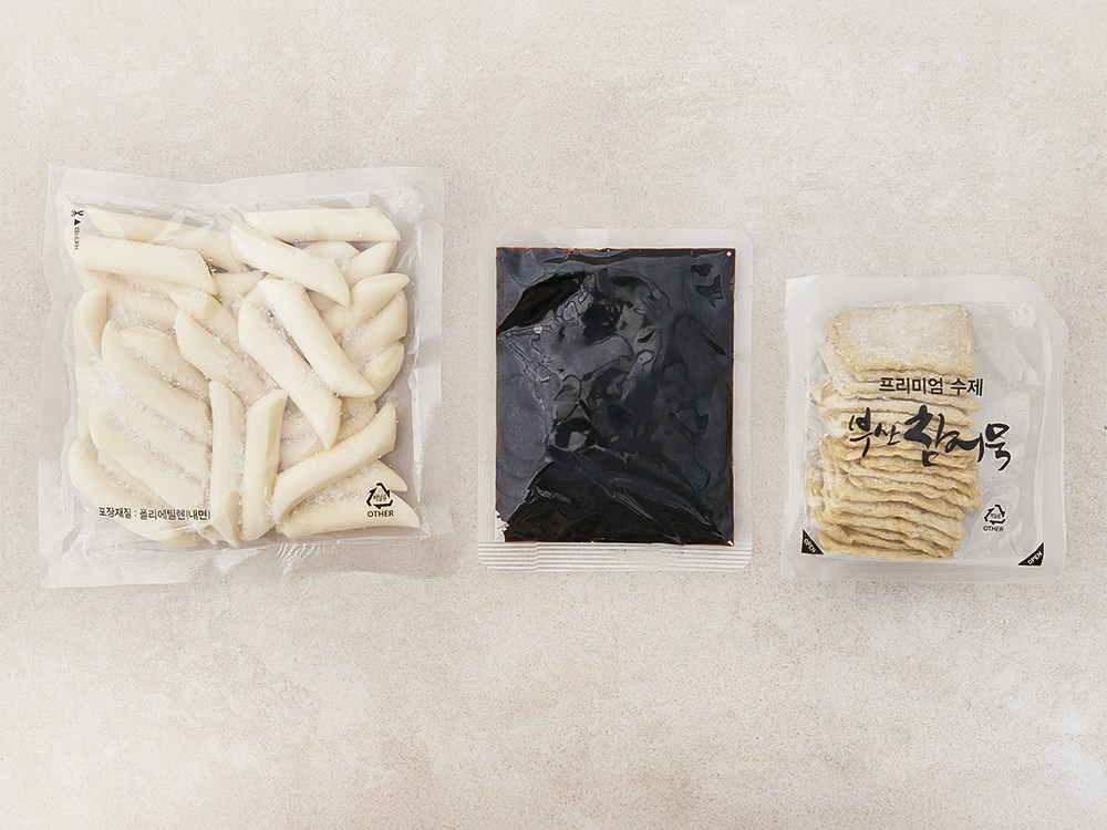 밀떡, 찐한 짜장떡볶이 소스(순한맛), 미니 사각 어묵으로 구성되어 있습니다.