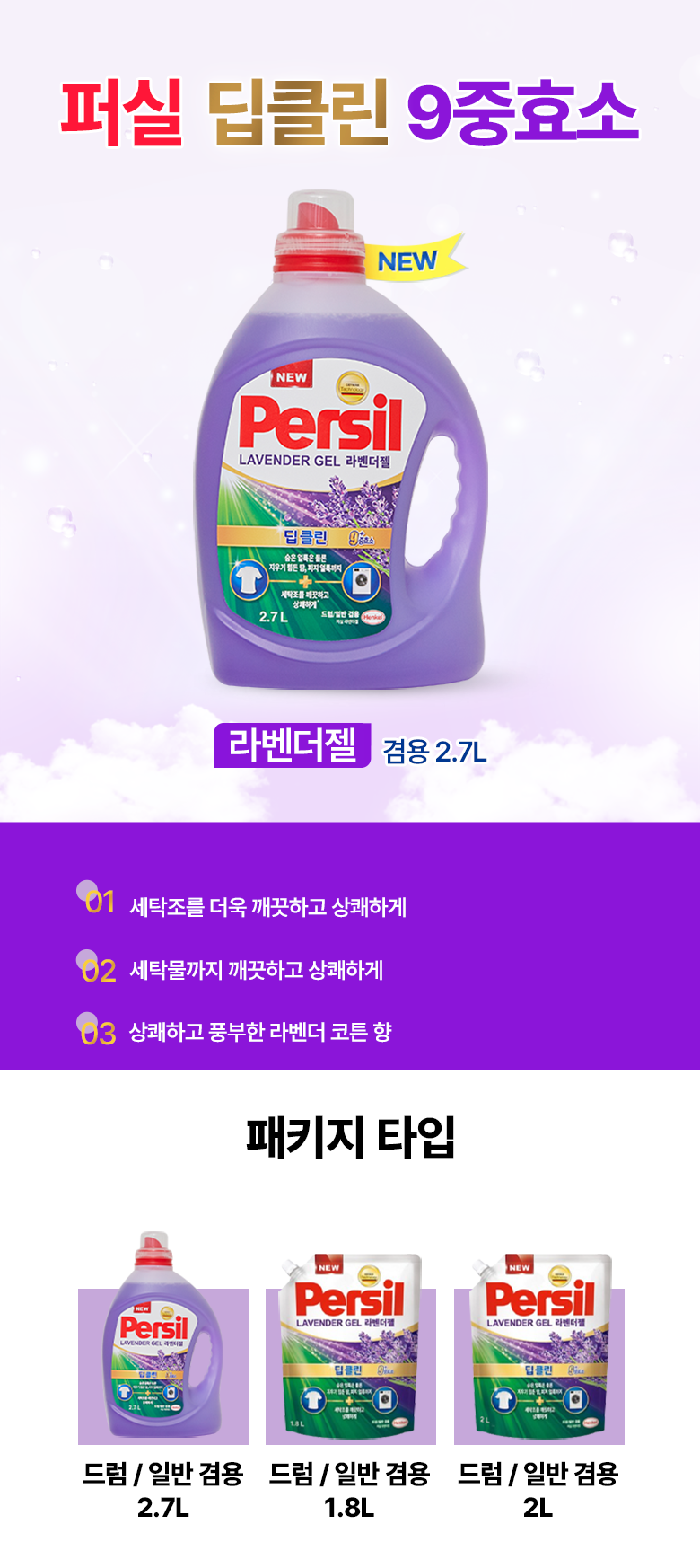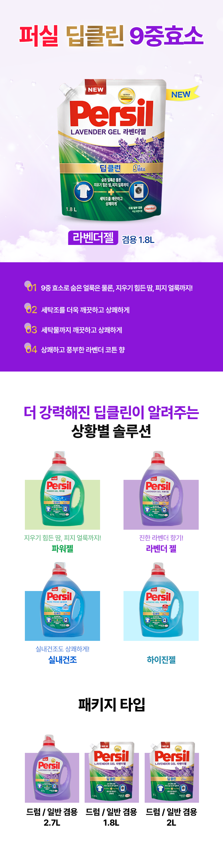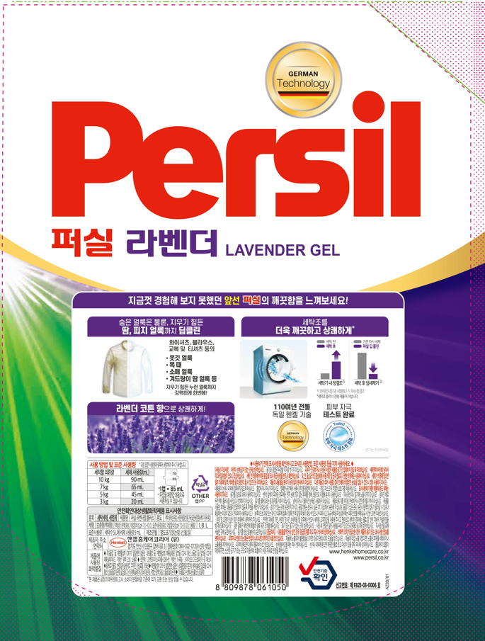 | 품목 및 제품명 | 세정제,세탁세제 / 퍼실 라벤더젤 플러스 | 용도(표백제의 경우 계열을 함께표시) 및 제형 | 일반용-기타표면세정용-세탁기내부용,섬유용 / 비분사형-액체형 |