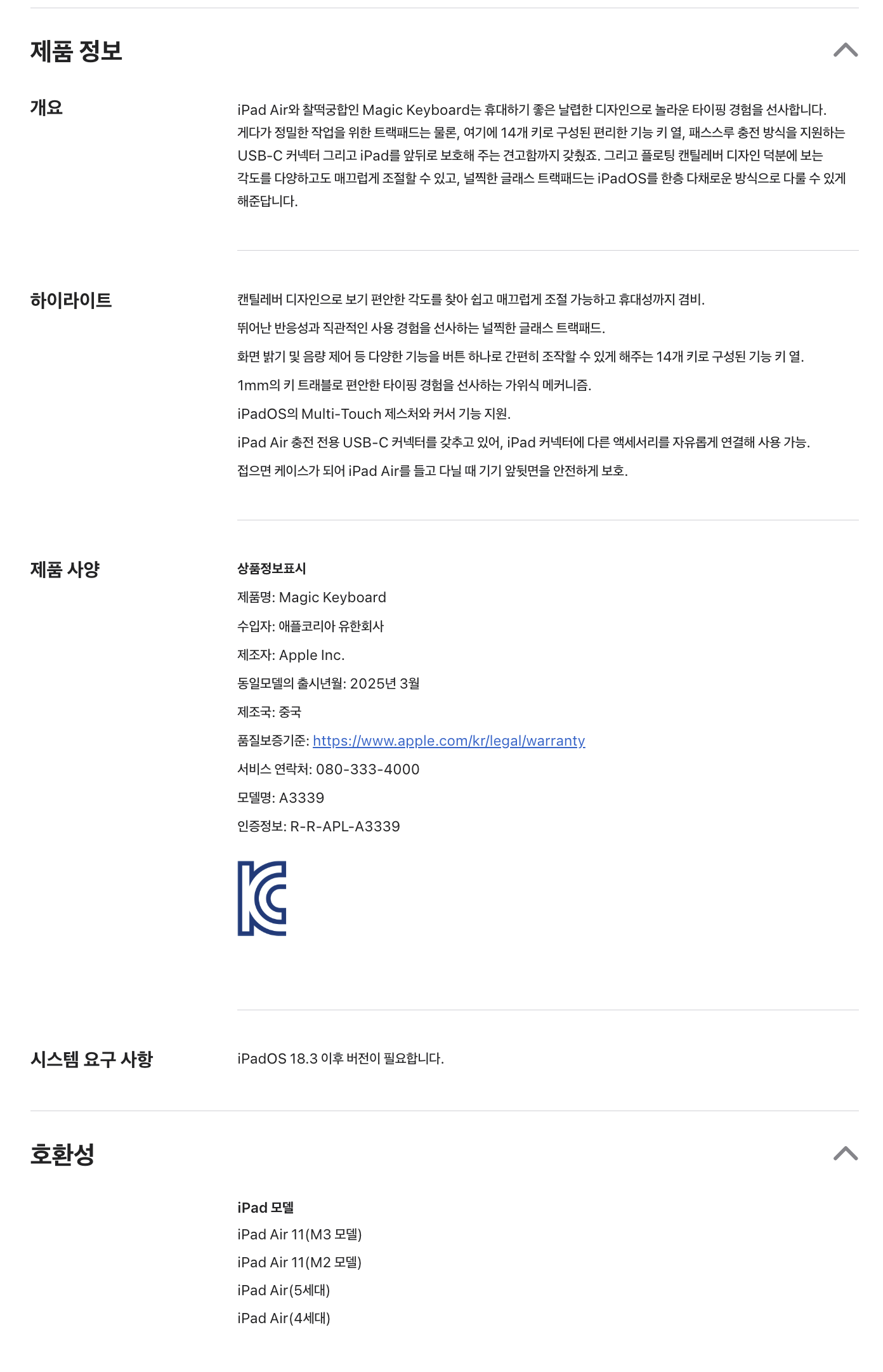 | 품명 및 모델명 | Apple 정품 매직 키보드 iPad Air(M3 모델)용 / A3339 | KC 인증정보 | R-R-APL-A3339 |