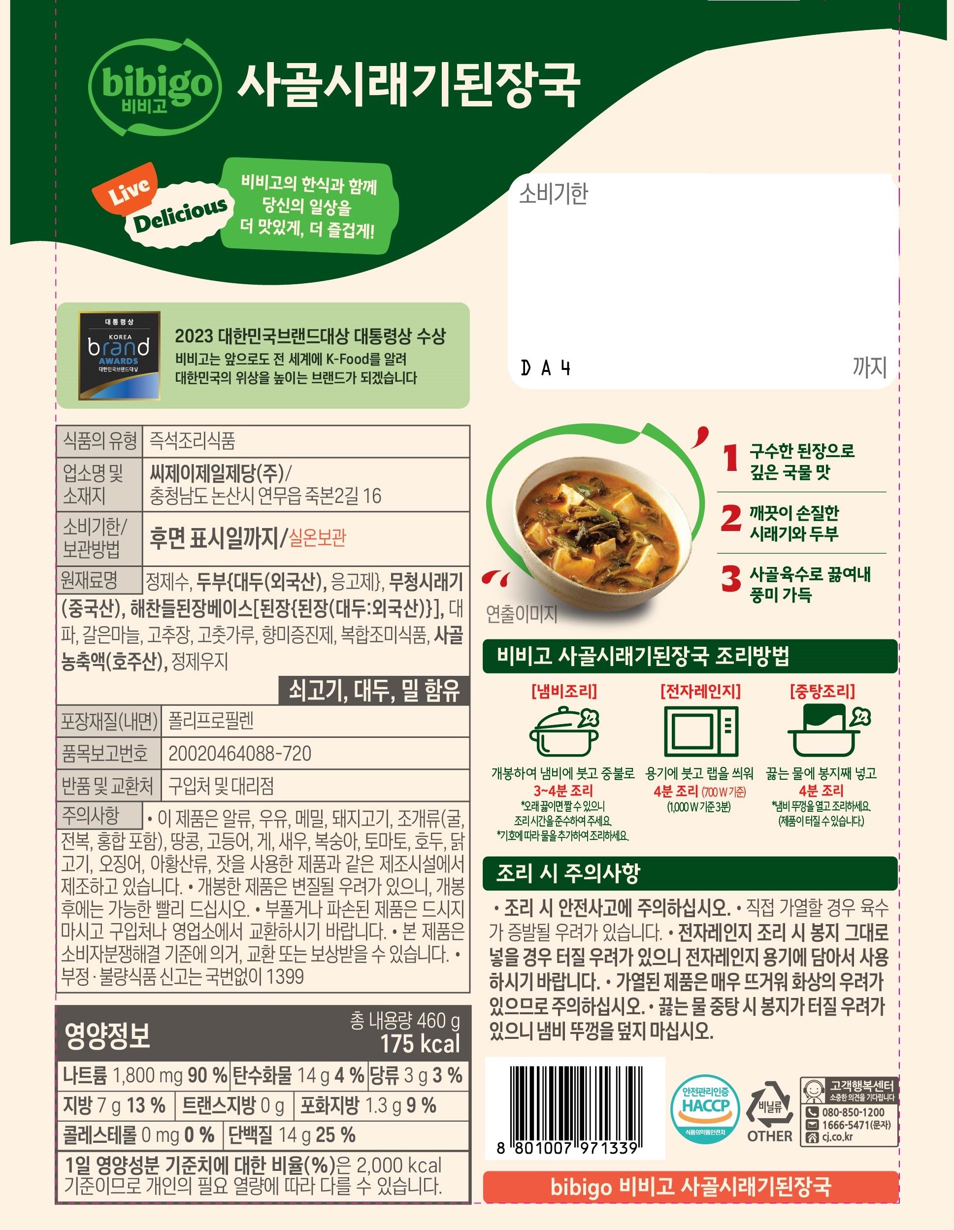| 제품명 | bibigo 비비고 사골시래기된장국 | 식품의 유형 | 컨텐츠 참조 |