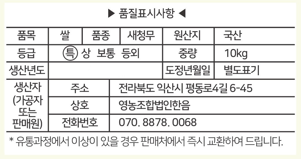 | 제조연월일, 소비기한 또는 품질유지기한 | 제조년월일 : 2025년 12월 12일 이후인 제조상품<br />생산일자 : 2025 | 세부 품목군별 표시사항 | 농수산물 : 유전자변형(해당 없음) / 지리적 표시사항(해당 없음) |