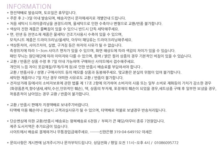 - ㆍ모니터 해상도의 차이로 인해 색상이나 이미지가 실제와 달라, 고객이 단순 변심으로 교환/반품을 무료로 요청하는 경우
