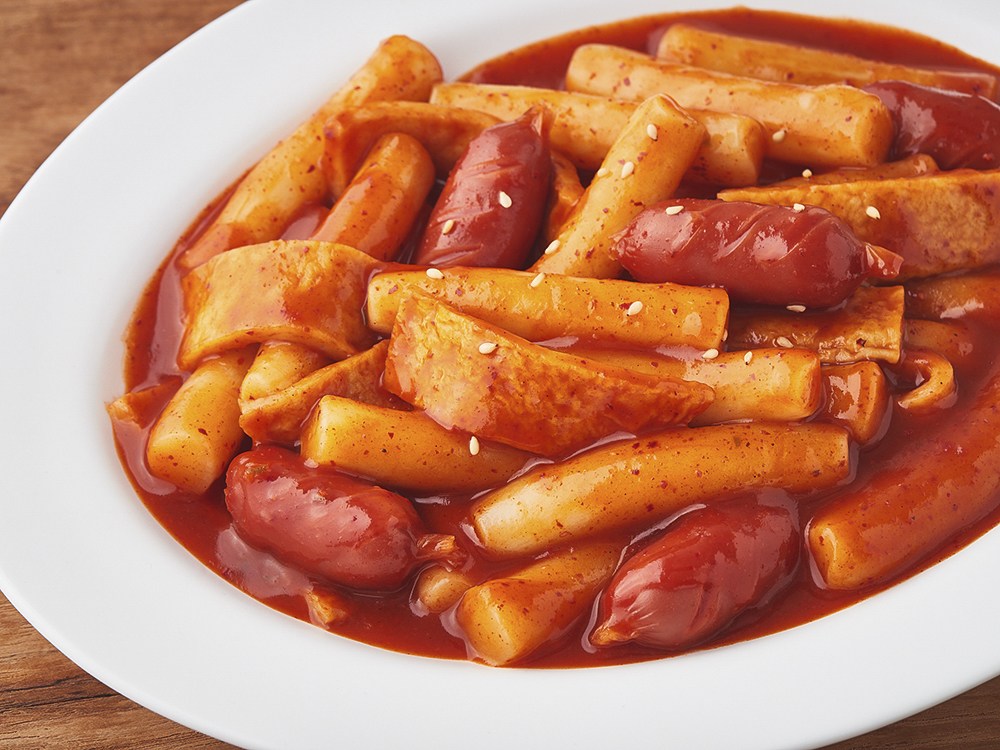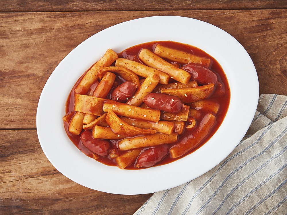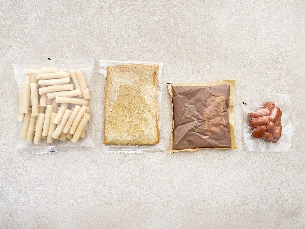 밀 떡볶이떡, 어묵, 소스, 소시지로 구성되어 있습니다.