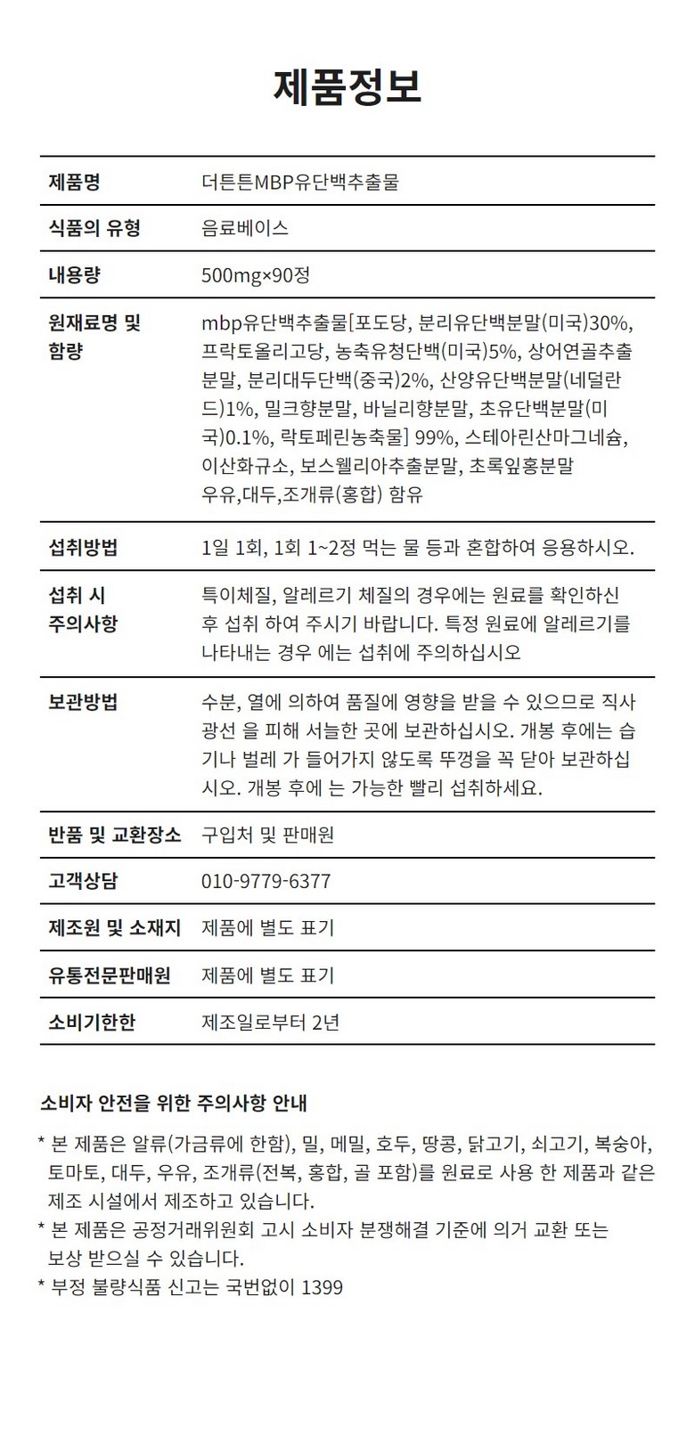 | 제품명 | 더튼튼 MBP 유단백추출물 | 식품의 유형 | 상품 상세페이지 참조 |