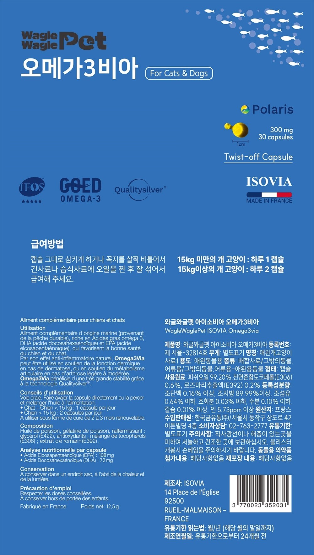 | 품명 및 모델명 | 와글와글펫 아이소비아 오메가3비아 | 인증/허가 사항 | 사료관리법에 따른 성분등록번호 : 컨텐츠 참조 |