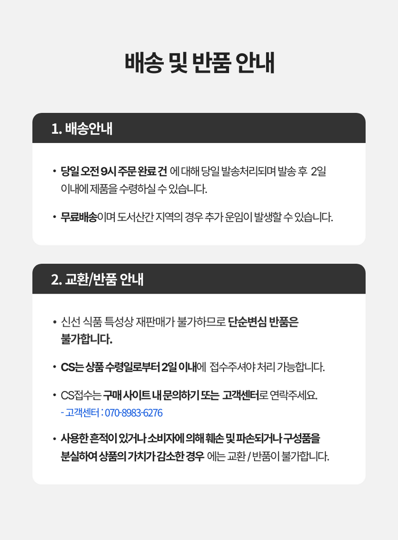 | 배송방법 | 신선/냉장/냉동 | 배송비 | 무료배송 - 도서산간 지역 배송불가 |