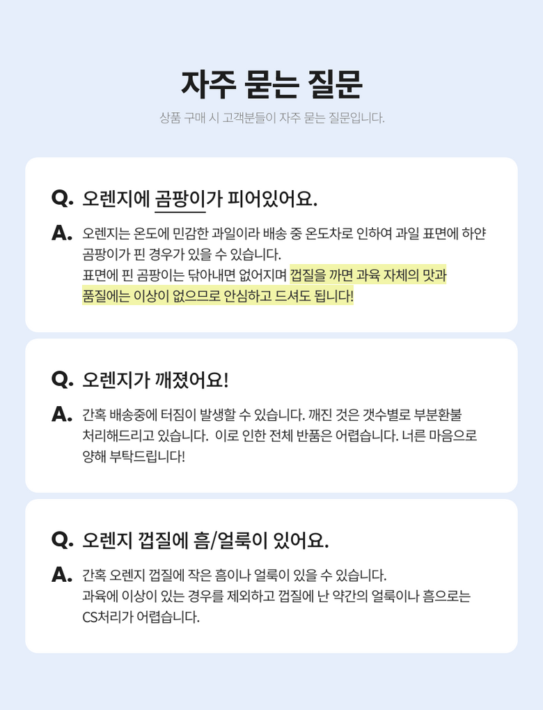 - 가격, 판매자, 교환/환불 및 배송 등 해당 상품 자체와 관련 없는 문의는 고객센터 내 1:1 문의하기를 이용해주세요.