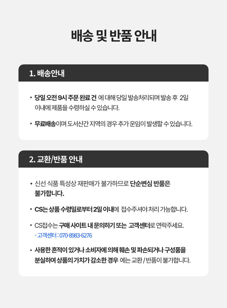 | 배송방법 | 신선/냉장/냉동 | 배송비 | 무료배송 - 도서산간 지역 배송불가 |