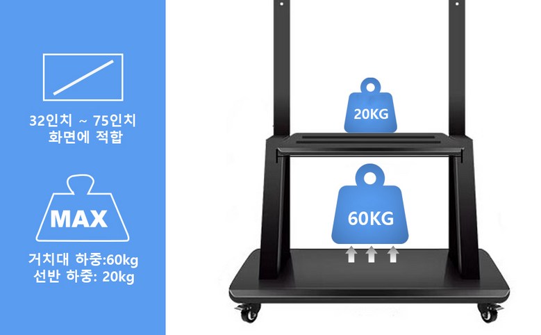 견고하고 내구성 강한 거치대:이동식 TV 거치대의 모든 부품은 두께 강화 냉간압연강으로 제작되어 사용 안전성과 안정성을 동시에 확보합니다.