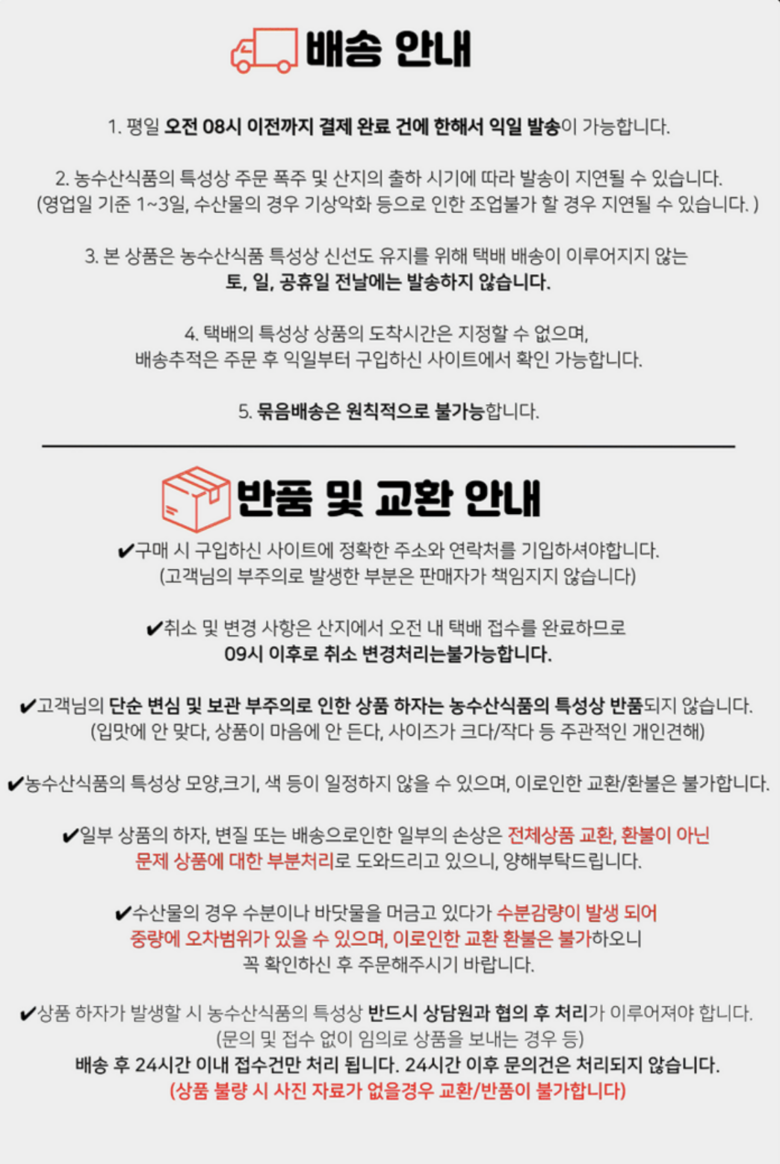 - ㆍ교환/반품에 관한 일반적인 사항은 판매자가 제시사항보다 관계법령이 우선합니다.