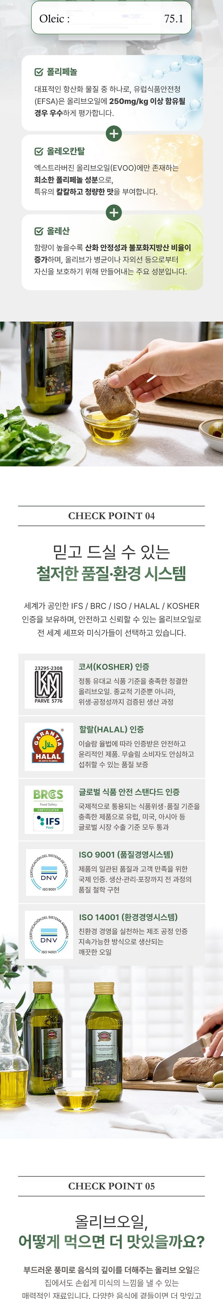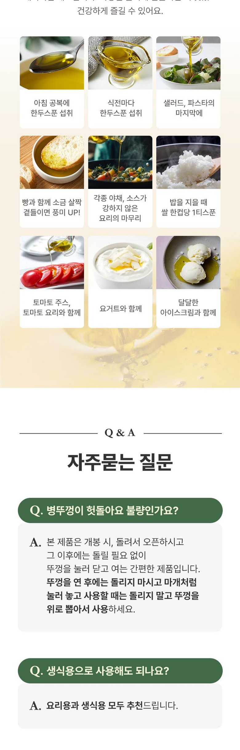 | 포장단위별 내용물의 용량(중량), 수량 | 500ml, 1병 | 원재료명 및 함량 | 압착올리브유 100% |