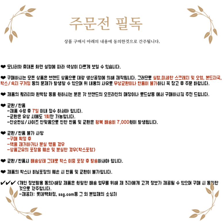 - ㆍ모니터 해상도의 차이로 인해 색상이나 이미지가 실제와 달라, 고객이 단순 변심으로 교환/반품을 무료로 요청하는 경우