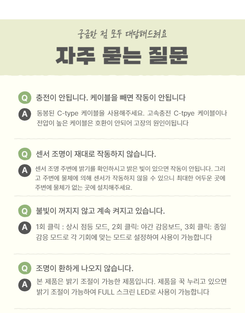 - 가격, 판매자, 교환/환불 및 배송 등 해당 상품 자체와 관련 없는 문의는 고객센터 내 1:1 문의하기를 이용해주세요.