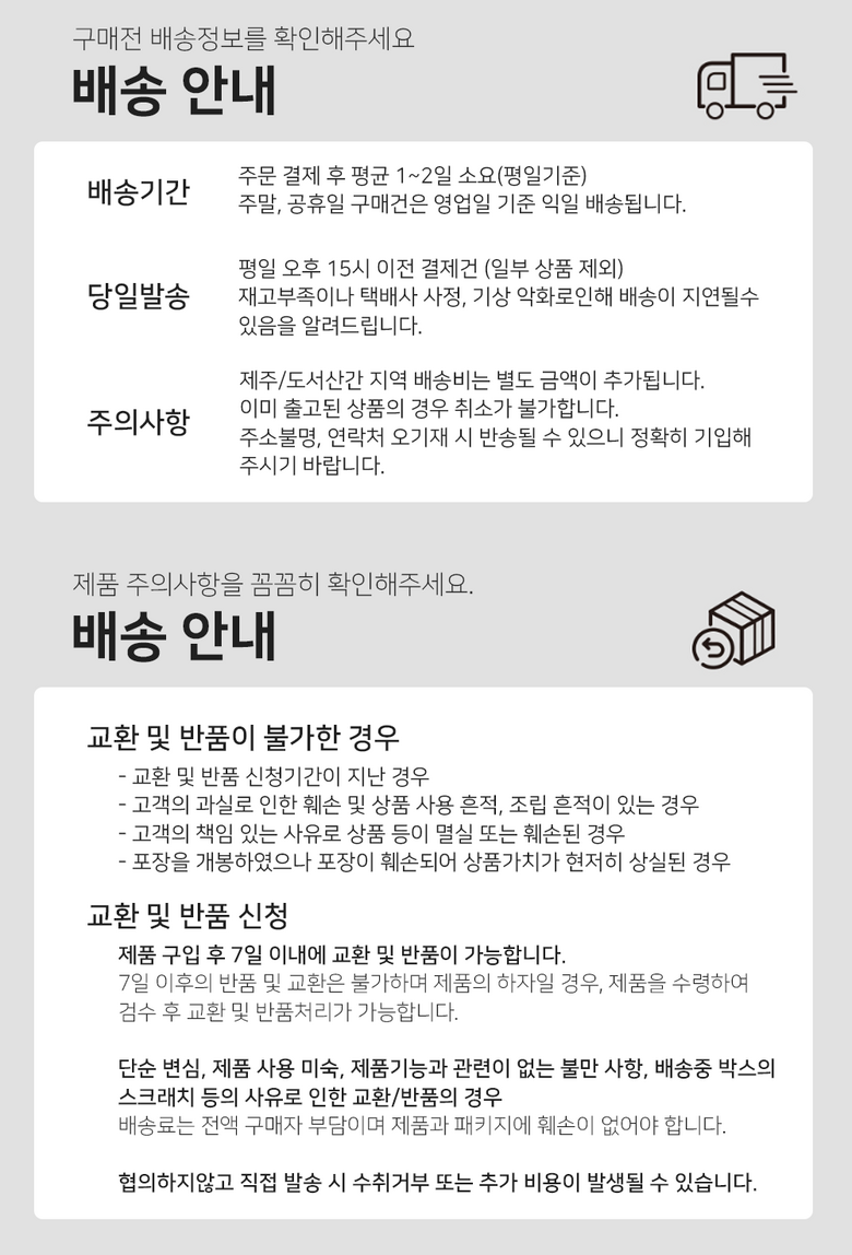 - ㆍ교환/반품에 관한 일반적인 사항은 판매자가 제시사항보다 관계법령이 우선합니다.