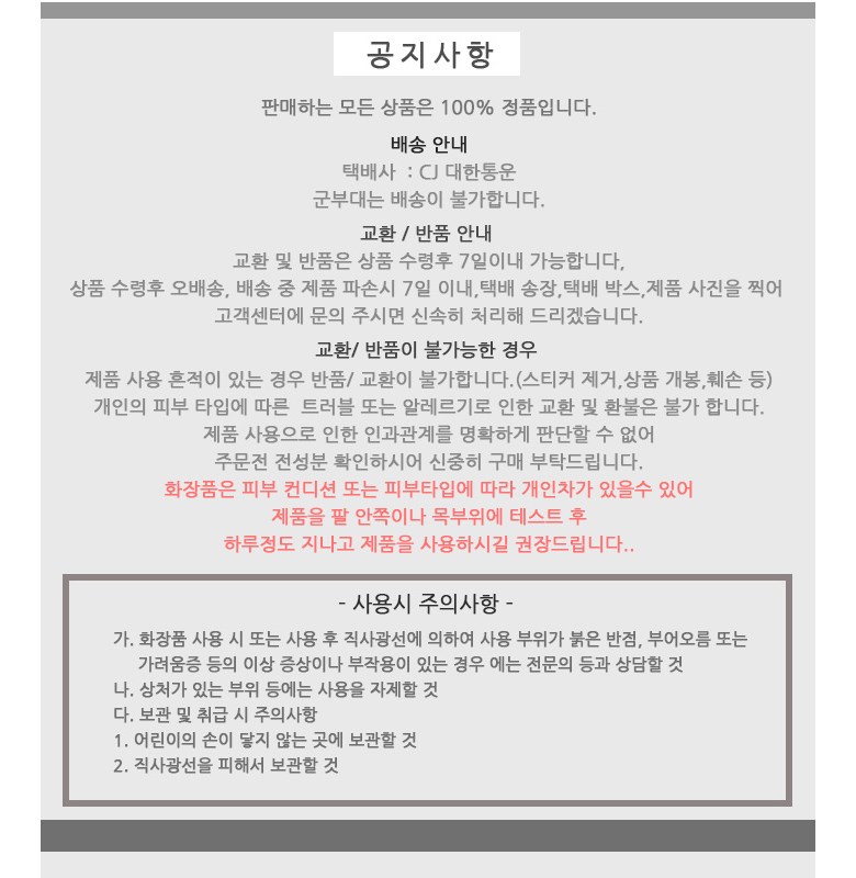 | 화장품제조업자, 화장품책임판매업자 및 맞춤형화장품판매업자 | 상품 상세페이지 참조 | 제조국 | 상품 상세페이지 참조 |