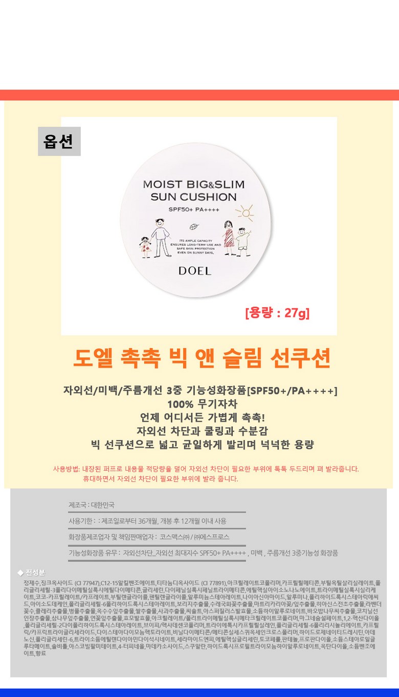 | 용량(중량) | 도엘 100%무기자차 대용량 슬림 썬쿠션 본품 선쿠션 1개 | 제품 주요 사양 | 상품 상세페이지 참조 |