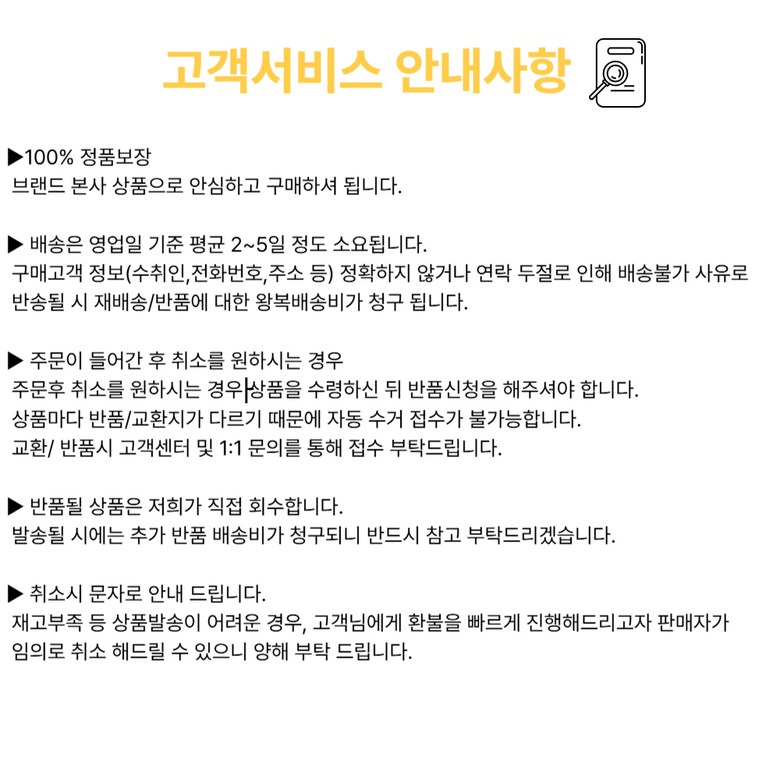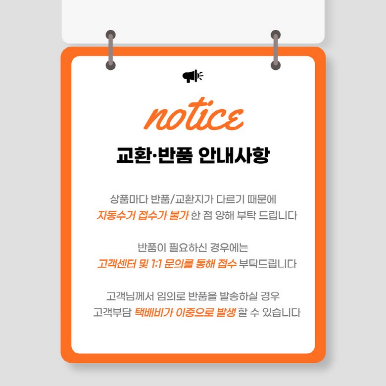 - ㆍ모니터 해상도의 차이로 인해 색상이나 이미지가 실제와 달라, 고객이 단순 변심으로 교환/반품을 무료로 요청하는 경우