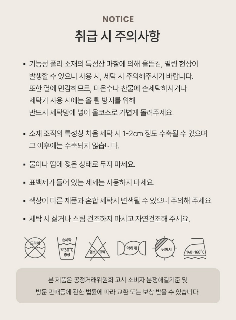 | 제조국 | 대한민국 | 취급시 주의사항 | 30'C 중성세제로 가볍게 손세탁하시고,삶거나 스팀건조 하지 마십시오. |