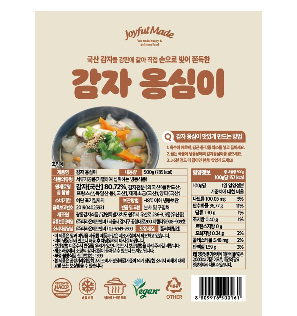 | 포장단위별 내용물의 용량(중량), 수량 | 컨텐츠 참조 | 원재료명 및 함량 | 감자[국산]80.72%, 감자전분[외국산(폴란드산,프랑스산,독일산등),국산], 재제소금(국산), 양파(국산) |