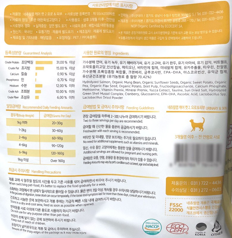 | 품명 및 모델명 | 네츄럴랩 케어 캣 2 요로&피부 | 인증/허가 사항 | 사료관리법에 따른 성분등록번호 : 컨텐츠 참조 |