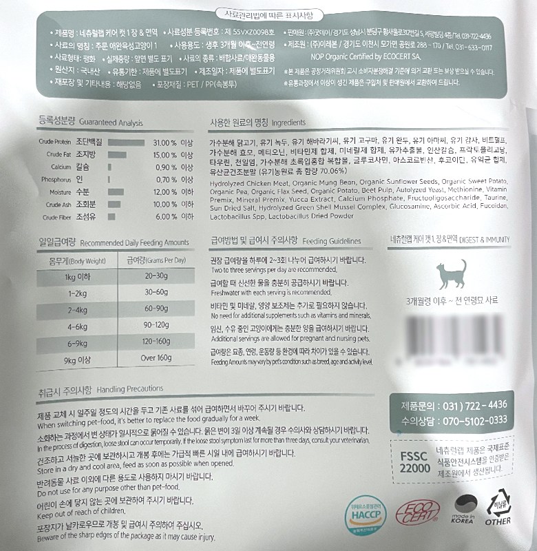 | 품명 및 모델명 | 네츄럴랩 케어 캣 1 장 & 면역 | 인증/허가 사항 | 사료관리법에 따른 성분등록번호 : 컨텐츠 참조 |