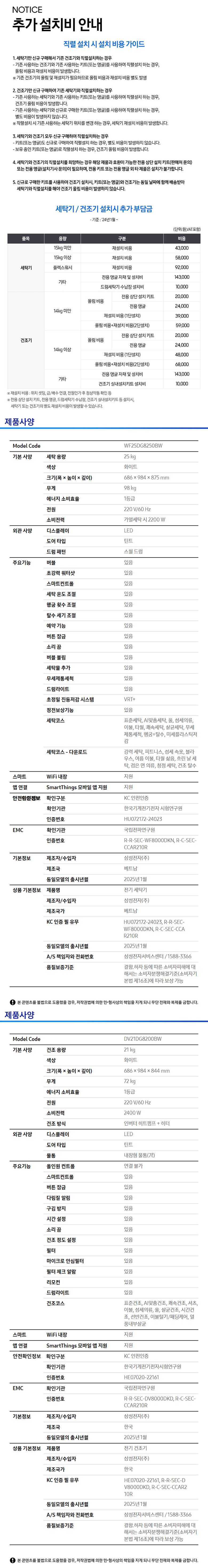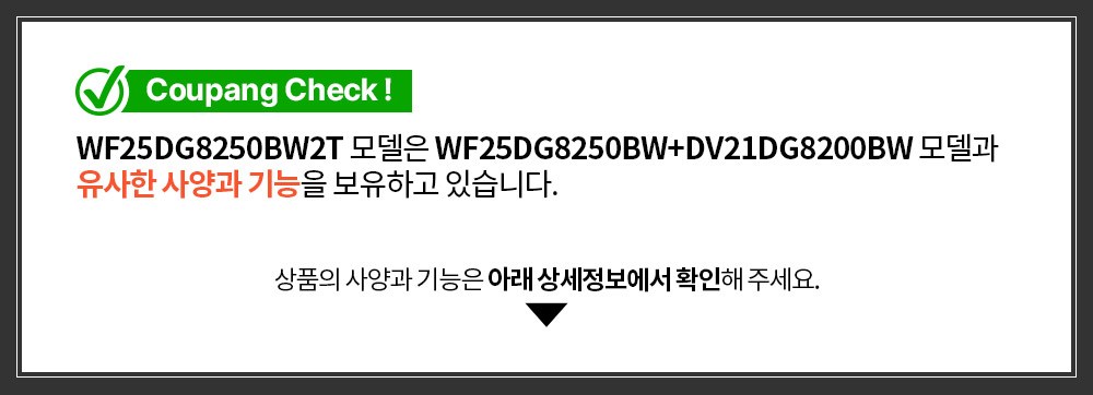 | 품명 및 모델명 | 세탁기 + 건조기 / WF25DG8250BW + DV21DG8200BW | KC 인증정보 | 건조기 : HE07020-22161A ,R-R-SEC-DV8000DKD / 세탁기 : HU072172-24023, R-R-SEC-WF8000DKN |