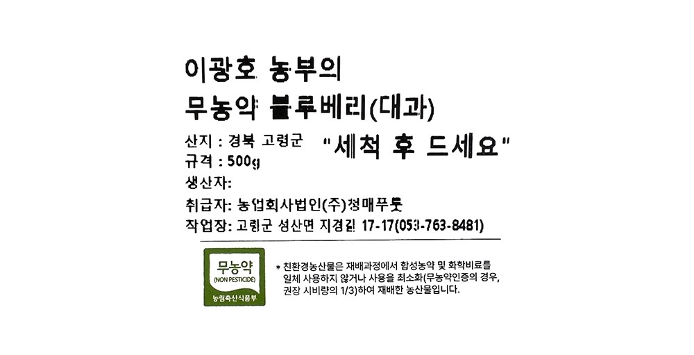 | 품목 또는 명칭 | 이광호 농부의 무농약 블루베리(대과) | 포장단위별 내용물의 용량(중량),수량,크기 | 컨텐츠 참조 |