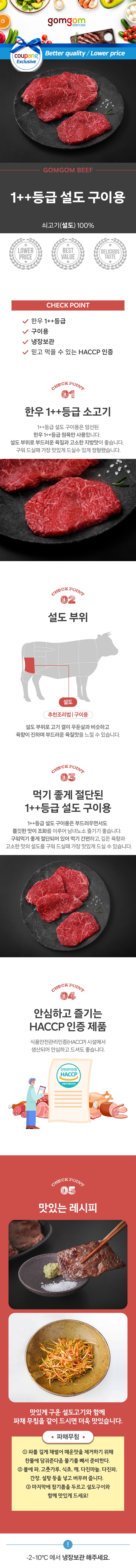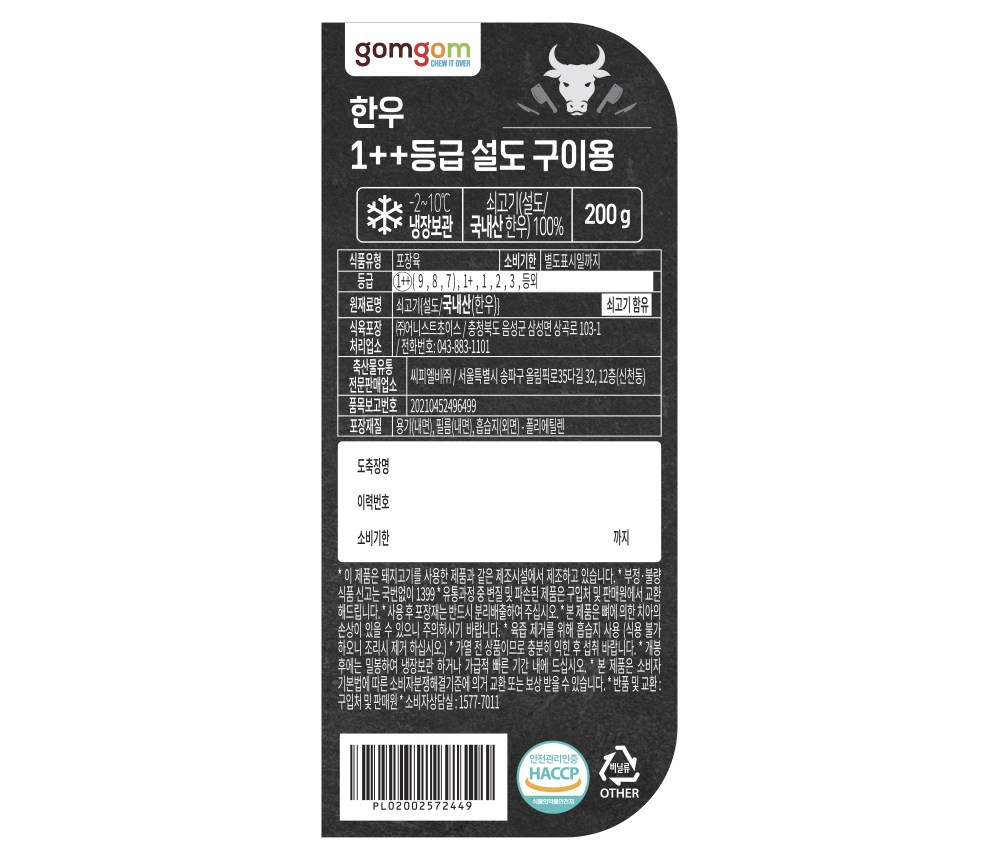 | 품목 또는 명칭 | 한우 1++등급 설도 구이용 | 포장단위별 내용물의 용량(중량),수량,크기 | 200g, 1개 |